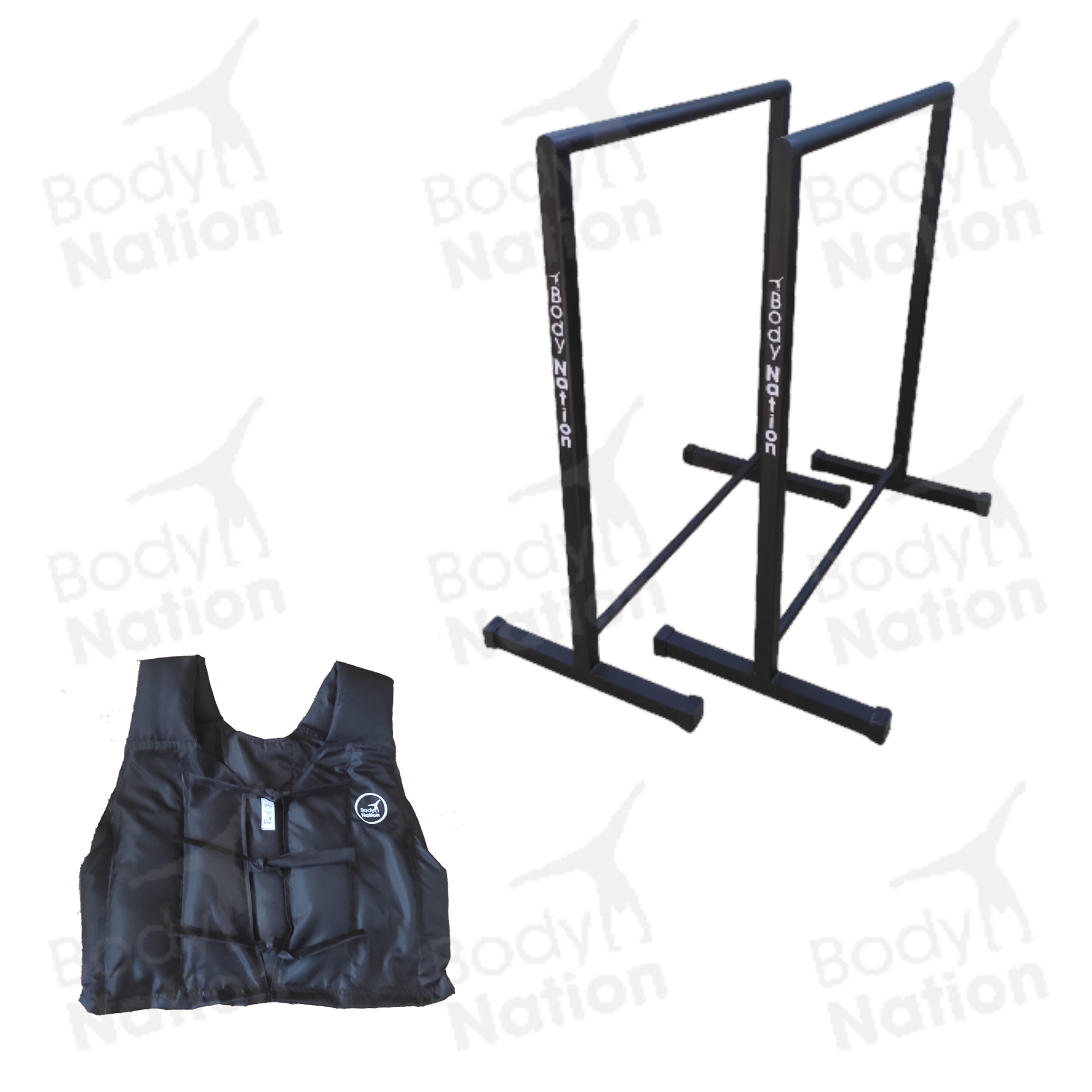 - Set que incluye un par de paralelas altas y un chaleco de lastre 10 kg.